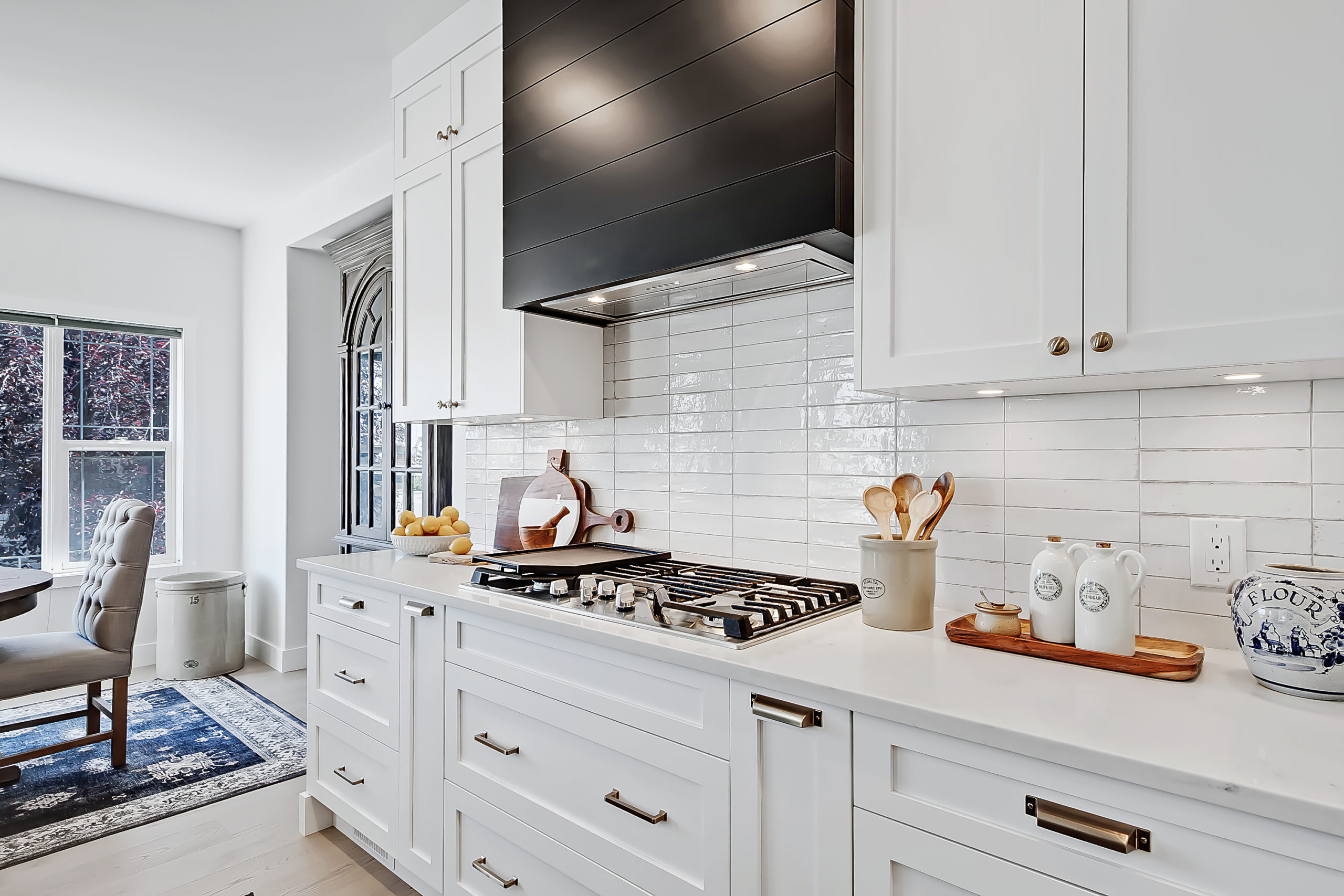 To soften the bold look of black and bring in the timeless feel they finished the base and upper cabinetry in white using a classic shaker style. This door style is popular in the Merit line up and is named ever so fittingly for this farmhouse style kitchen – the Prairie School door.