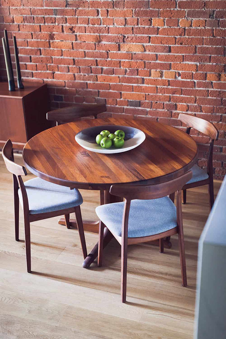Lum loves mid-century Danish furniture—she brought a vintage Danish dining table and chairs from her previous home, which Burke reupholstered—so more pieces were added to match that aesthetic, like a Bensen L-shaped sofa in heathered grey fabric and the classic Tulip tables found in the living room and bedside. “I like modern furniture, but I wanted to incorporate that into this space, which isn’t really modern at all,” says Lum.
