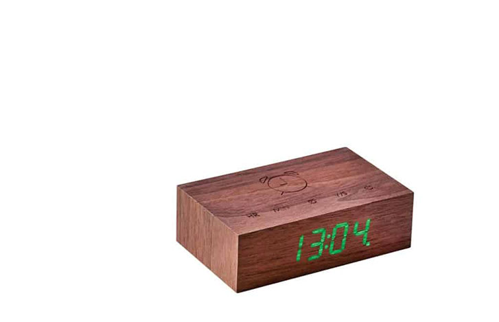 Crafted from natural wood but equipped with a sound-activated LED system and the latest in “flip” tech—simply turn the object over to shut off the alarm—the Gingko Flip Click clock ($69) combines tradition and innovation. designhouse.com