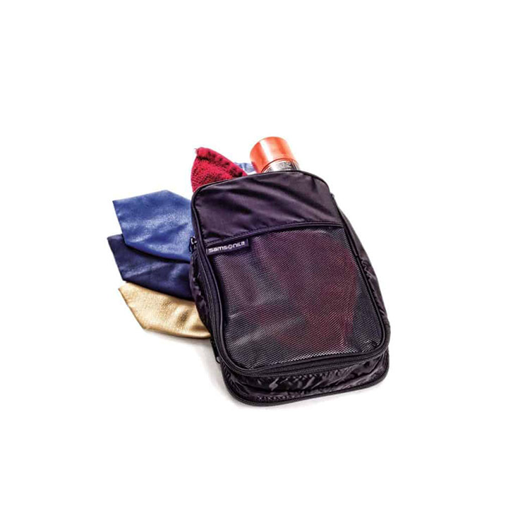 When it comes to packing a suitcase, compartmentalizing is key. Insert the packing cube: small, rectangular or square-shaped zipped bags meant to compress and organize your clothes, save space and reduce wrinkles all in one. “They keep your items nicely sorted together so they’re not all jumbled in your suitcase,” says Stoller. Using packing cubes means you won’t have to upend your entire suitcase just to grab a single item anymore. You can separate your beach clothes from your going out clothes or dirty clothes from clean clothes in no trouble.Samsonite or Amazon are Stoller’s go-to online stops for her packing cube needs—at least until she has her own branded packing cubes ready.